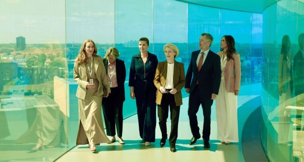 Statsminister Mette Frederiksen (S), EU-Kommissionens formand Ursula von der Leyen, kong Frederik og dronning Mary vises rundt i Olafur Eliassons værk ’Your rainbow panorama’ på toppen af kunstmuseet Aros. (Foto: Nikolai Linares | VisitAarhus | LinkedIn.com | PR)